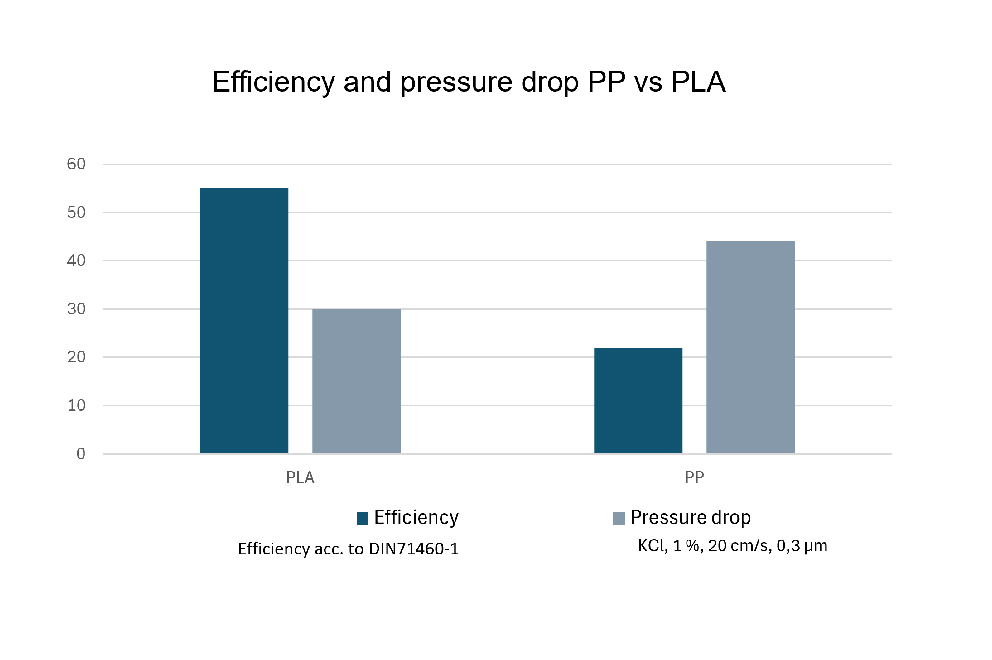 Beyond its environmental advantages, PLA nonwoven demonstrates superior technical performance through enhanced filtration efficiency and lower pressure drop. The polymer structure of PLA offers a longer service life over conventional PP nonwovens, resulting in extended maintenance intervals and improved overall system efficiency. (Grafik Efficiency & pressure drop PP vs. PLA)